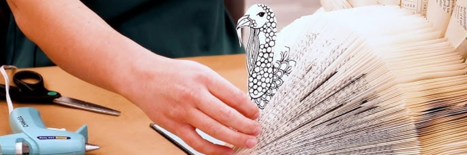 Create a turkey centerpiece by folding and cutting a used book. For teens and adults, supplies provided. Please call 435-336-3070 to register.
